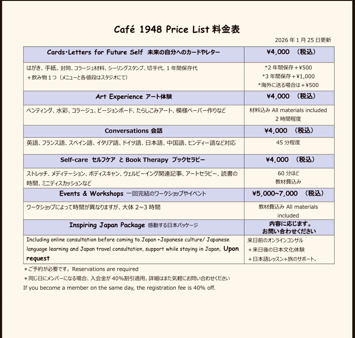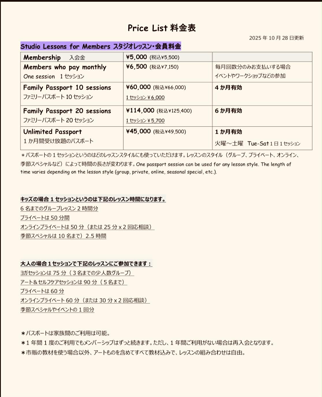 料金表/ Price List